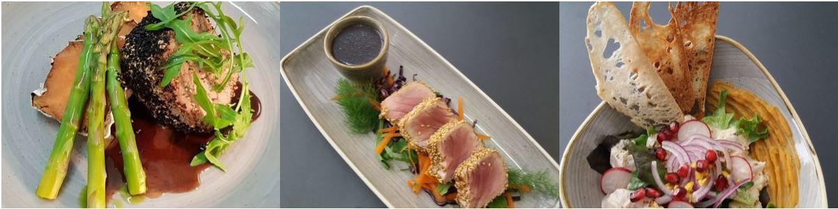 A ementa apresenta uma escolha variada de ingredientes, oferecendo opções desde carnes a pratos vegetarianos, não esquecendo as sobremesas que colocam o ponto final perfeito, como o Semifreddo de Chocolate. Um dos pratos que irá deliciar hóspedes e locais é o Tataki de Atum, com um toque oriental, para começar bem a refeição, ou o Risotto Portobello, para amantes da cozinha vegetariana. De salientar o peixe da nossa costa e o Roast Beef, um prato de carne de excelência. Para além disso, haverá também outros pratos típicos mais conhecidos, como o Bife à Regional, Bacalhau à Portuguesa ou o Polvo.