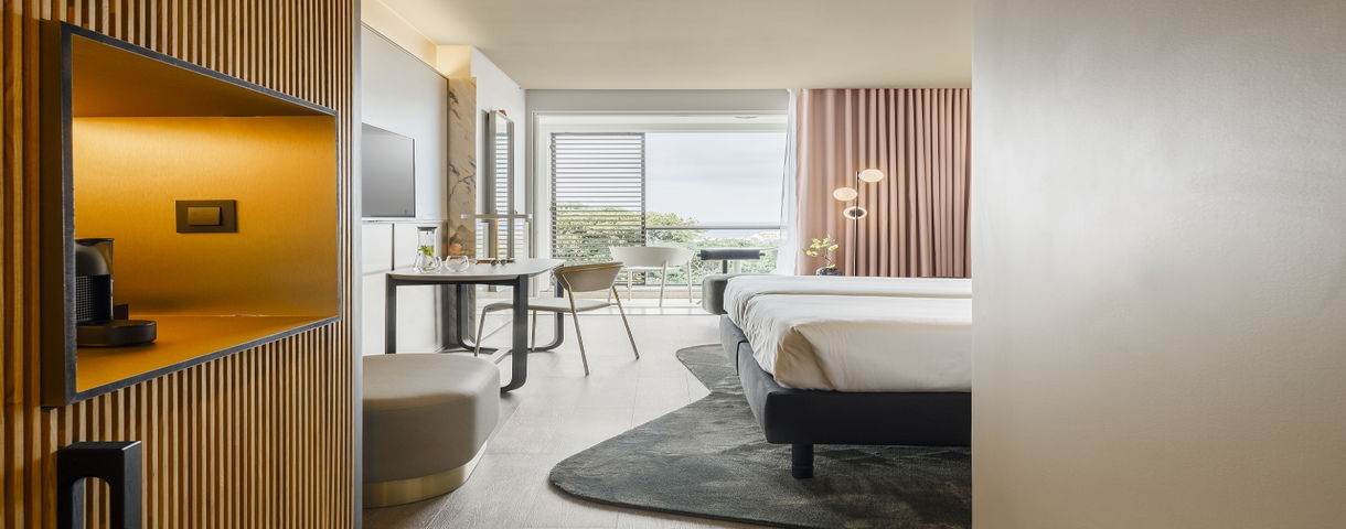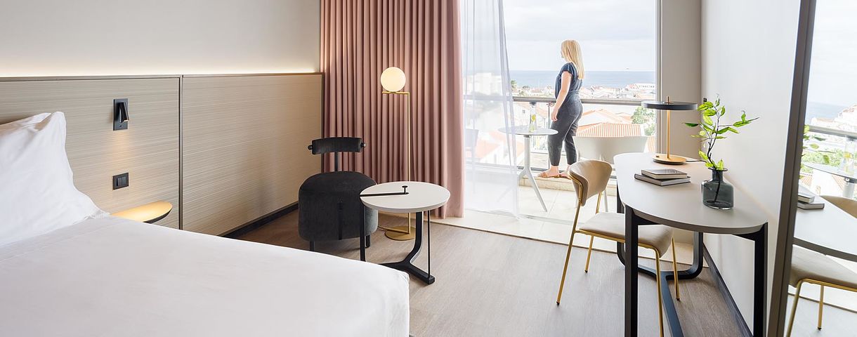 Tipologias de quartos superiores incluem ainda: Estacionamento gratuito nas tipologias superiores | Máquina de Café Nespresso (oferta de 4 cápsulas diárias nas suites) | Produtos de Higiene diferenciados | Roupão | Vista Rua/Mar | Varanda