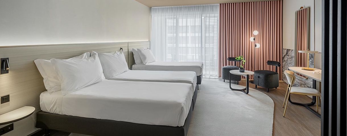 O quarto Level Family Room possui 3 camas individuais, 2 casas-de-banho e conjuga o conforto com a tranquilidade. Cada quarto foi criado com detalhes funcionais e oferecem todas as comodidades (roupeiro, secador de cabelo, roupão, produtos de higiene gratuitos e água durante a estadia). O quarto é climatizado, tem TV com canais locais e internacionais, mini-bar e Wi-Fi gratuita. Poderá ter acesso online a jornais e revistas disponibilizados gratuitamente no nosso hotel através da app Press Reader. Também disponibilizamos o serviço de despertar. Room service disponível, com preçário e horário específicos. Estacionamento gratuito. Acesso gratuito ao Wellness Center e piscina exterior.