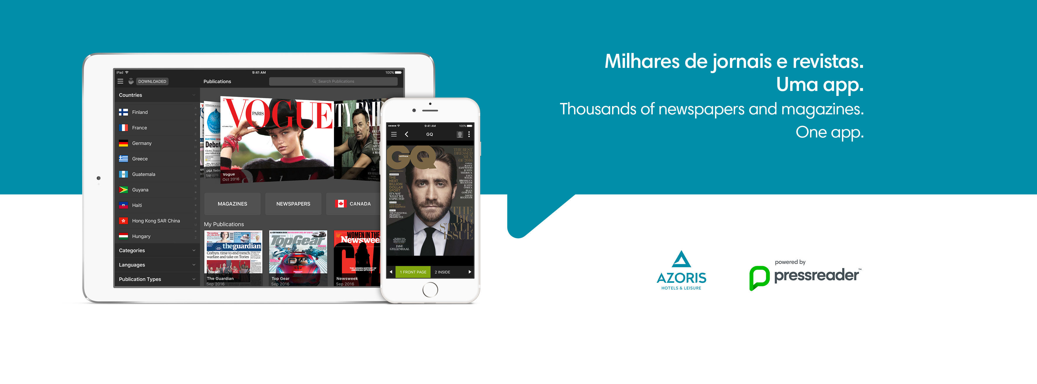 Os Hotéis da Azoris Hotels & Leisure oferecem aos seus hóspedes o acesso aos jornais e revistas de todo o mundo (mais de 5.000 jornais e revistas) através da APP Press Reader.
